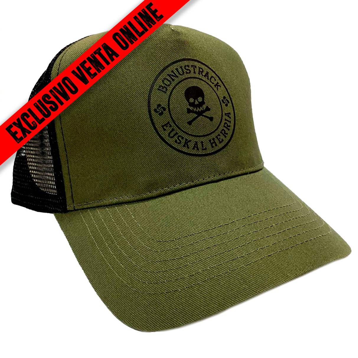 Gorra trucker BonusTrack Euskal Herria 5 paneles, panel frontal y visera color verde oliva/negra. 100% algodón. Producto exclusivo venta online.