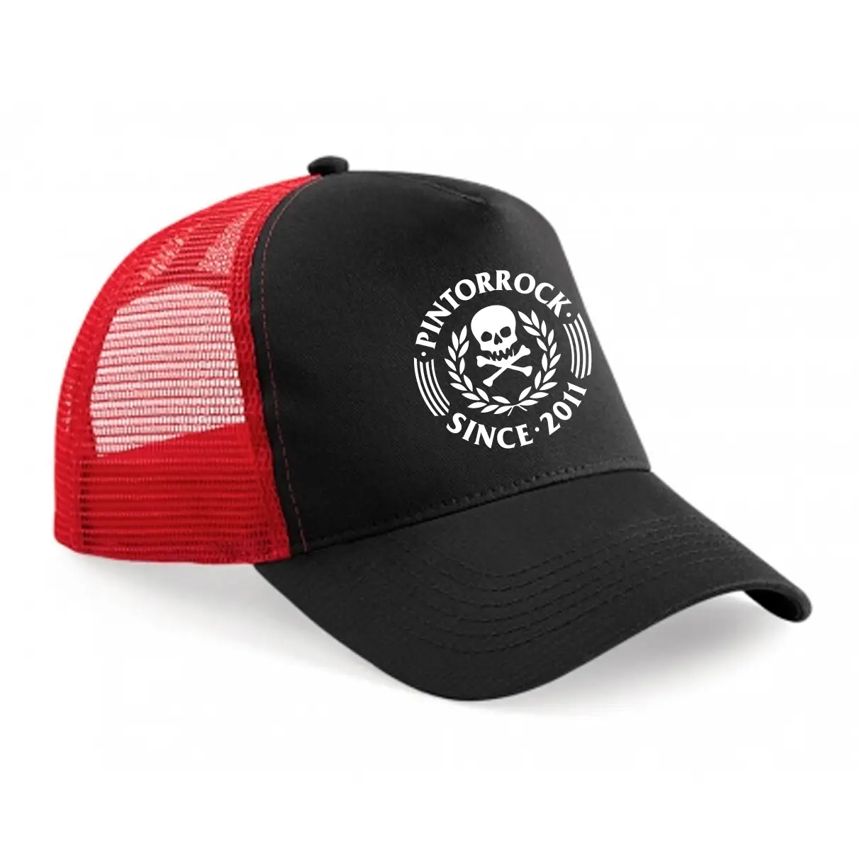 Gorra trucker PintorRock 5 paneles, panel frontal y visera color negra y roja. 100% algodón.