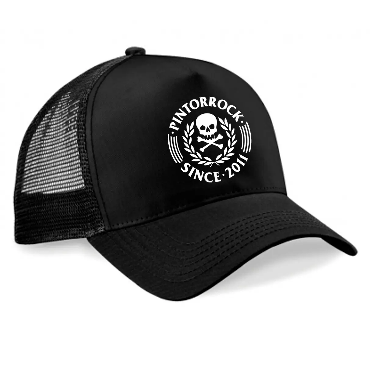 Gorra trucker PintorRock 5 paneles, panel frontal y visera color negra. 100% algodón.