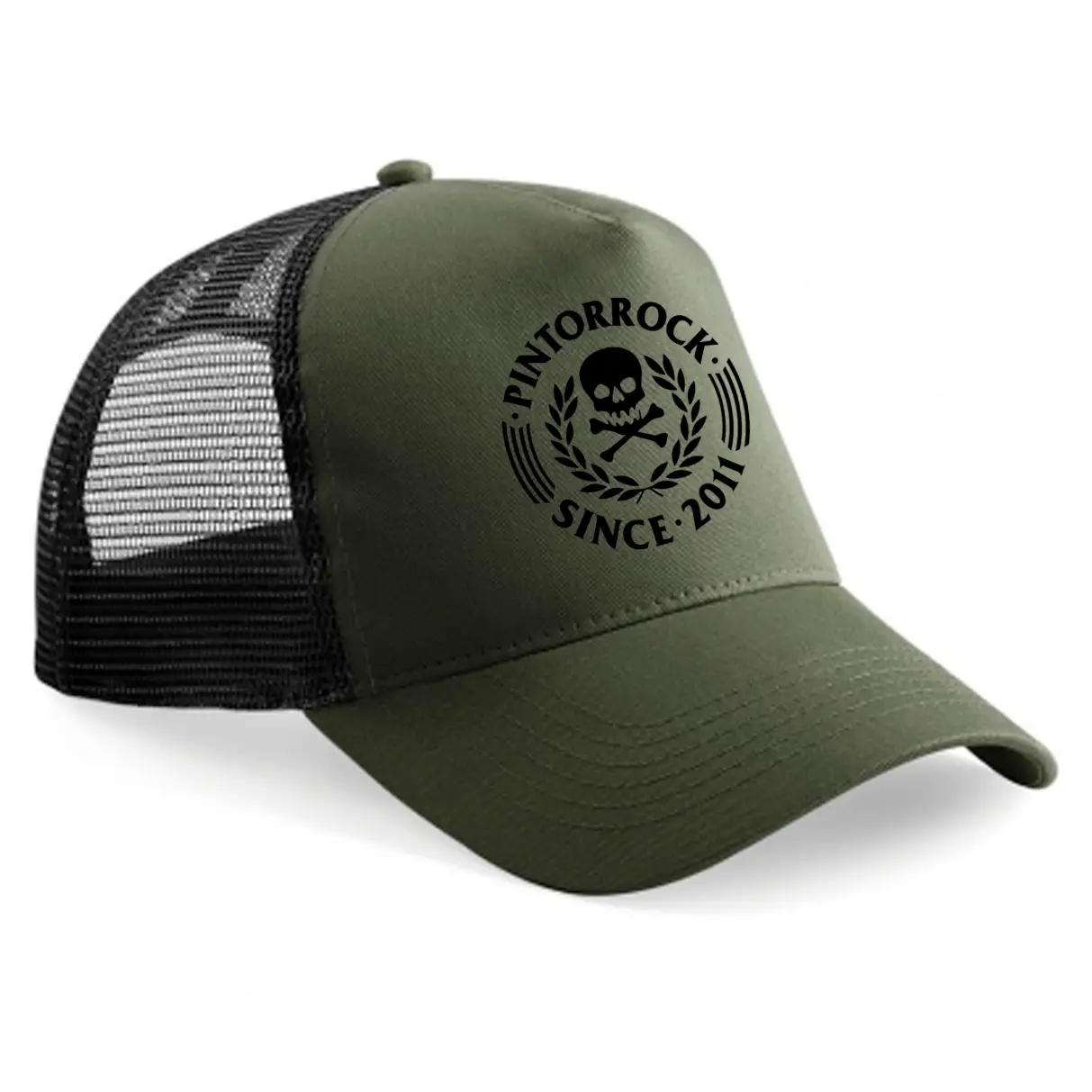 Gorra trucker PintorRock 5 paneles, panel frontal y visera color verde oliva/negra. 100% algodón.