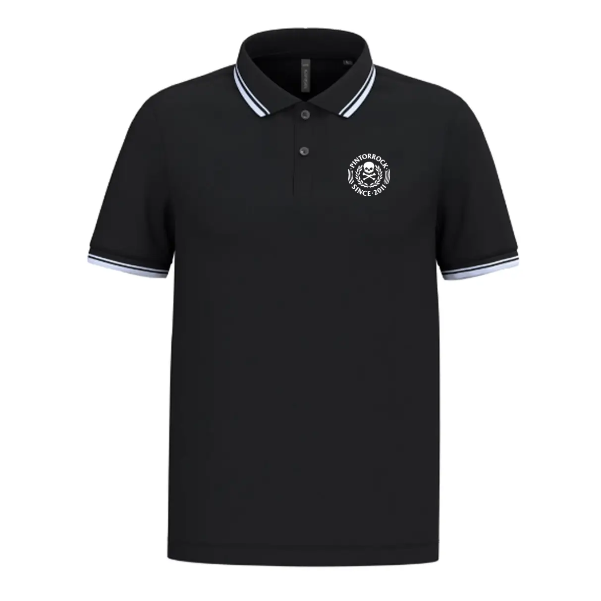 Polo PintorRock Unisex negro – blancas 100& algodón con logo bordado en pecho izquierdo.